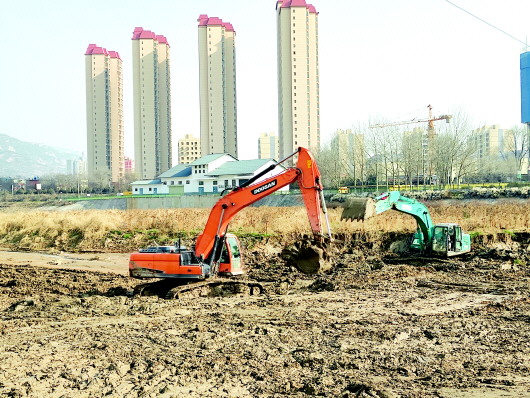 12月20日,挖掘机在藉河风情线五里铺段作业。近期,秦州区有关部门开展河道整治,铲除杂草,清淤疏浚,提升河道功能,保护河道生态环境,确保行洪畅通和水环境根本好转。目前该工程已完成工程量的70%,计划月底完工。 新天水·天水日报记者 何郁 摄