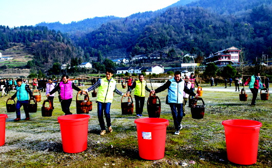 12月20日,秭归县九畹溪镇农民在该镇石柱村参加挑水比赛。冬季农闲,湖北省秭归县九畹溪镇组织当地农民参加挑水、拔河、搓玉米、包饺子等丰富多彩的活动,庆祝丰收,喜迎新年。