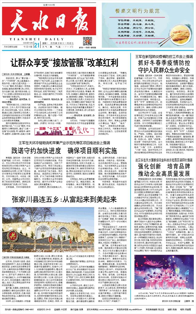 本报讯【新天水·天水日报记者马放】12月18日下午,市委副书记、市长王军主持召开全市新冠肺炎疫情防控工作会议。他强调,各级各部门要深入贯彻习近平总书记关于疫情防控的重要讲话和指示精神,认真落实中央、省市关于疫情防控最新部署要求,时刻绷紧思想之弦,慎终如始抓好冬春季,特别是元旦、春节“双节”疫情防控工作,统筹推进常态化疫情防控和经济社会发展工作,确保人民群众身体健康和经济社会大局稳定。