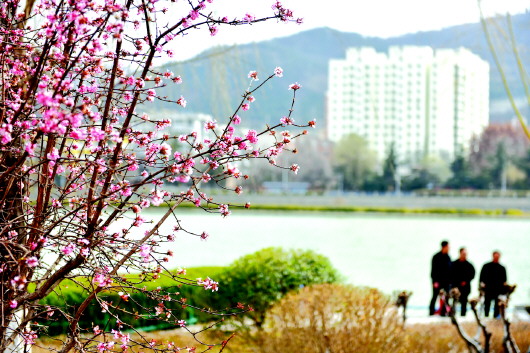 2月23日,市民在天水湖边休闲。初春时节,藉河风情线、中日友好樱花园、人民公园等地迎春花、早春梅、玉兰花等竞相绽放,花香满城,美景如画。