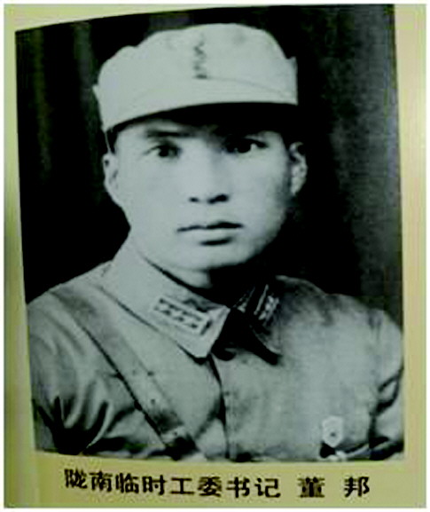 董邦,原名董振国,1914年出生于天水县关子镇(今属天水市秦州区)。1929参加冯玉祥的国民革命第一军。1931年,董邦参加了著名的“宁都起义”,从此,他成为一名由中国共产党领导的红军战士。1932年加入中国共产党。在多次战斗中,他英勇善战,机敏灵活,受到领导的表彰。1934年10月,董邦随中央红军参加了举世瞩目的二万五千里长征。在长征途中他多次参战,克服了各种困难,终于跟随红军部队到达陕北革命根据地。他曾任周恩来的随从副官。1938年,在三原联络站工作期间,受陕西省委的派遣,回到天水从事党的秘密工作。在10余年的秘密工作中,他经历了充满白色恐怖的刀光剑影和腥风血雨。在此期间,他曾落入敌人的“虎口”,在狱中受尽了酷刑,但他的革命意志、信念却始终没有动摇,还同敌人展开了巧妙的斗争。