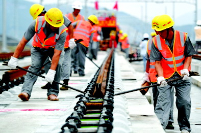 6月22日,中铁十一局的施工人员在杭绍台铁路上进行铺轨作业。当日,我国首条民营控股高铁杭绍台铁路全线铺轨贯通,为年底开通运营奠定基础。杭绍台铁路连接浙江杭州、绍兴和台州三地,线路设计时速350公里。