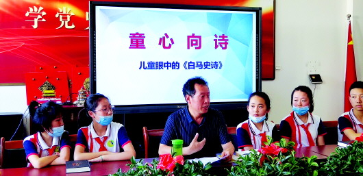 夏日的一个下午,在新华门小学人民路分校二楼的会议室里,近30名小学生手捧着《白马史诗》,向作者汪渺提问或畅谈自己的读后感。汪渺和孩子们谈起了这本书的创作历程,他说为了这部一万行的《白马史诗》,自己专门到白马族山寨进行了采访,此后又花了一年半的时间对白马族文化和其民间传说进行整理,并融合陇南和天水两地民歌,花了两年时间才真正写成了这本书。
