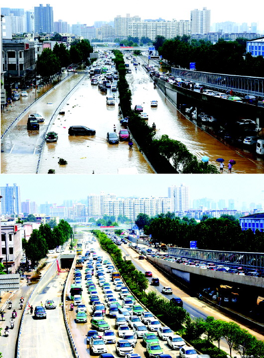 上图为7月21日,郑州市京广路航海路交通口被淹,道路受阻;下图为7月24日,郑州市京广路航海路交通口已被抢通,交通恢复。连日来,各地救援人员在河南郑州积极开展排涝、清淤等各项灾后重建工作,遭遇强降雨天气的郑州的生活秩序正在逐步恢复。