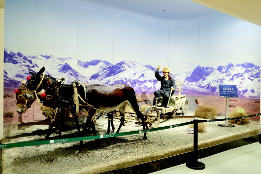 祁连山下,一个头戴羊皮帽的男人,手里挥舞着鞭子,驾着四头毛驴,在砂砾路上缓慢行驶……甘肃公路博物馆的一个角落,生动还原了20世纪六七十年代甘肃养路工人用毛驴刮路车养护公路的场景。