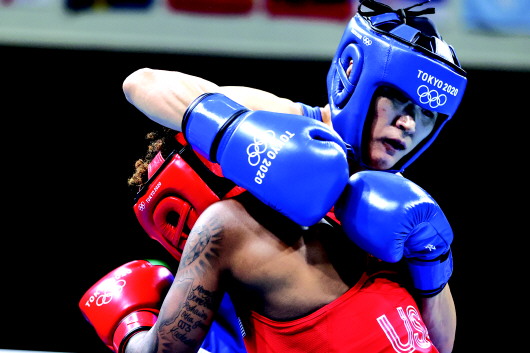 当日,在东京奥运会拳击女子沉量级半决赛中,中国选手谷红战胜美国选手琼斯,晋级决赛。