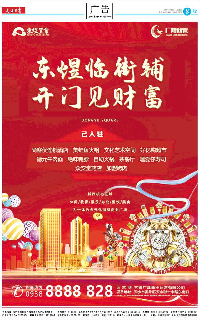 广告经营中心:8286868 融媒体经营部:8212867 印务发行部:8272627 零售价:1.00元 年价:372元 订阅处:全国各地邮政局(所) 印刷:天水新华印刷厂 地址:天水市秦州区赤峪路109号