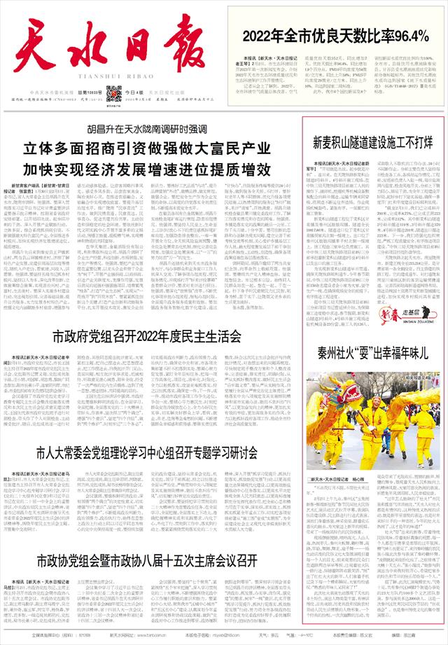 本报讯【新天水·天水日报记者王琴】2月2日,市生态环境局召开2023年第一次新闻发布会,介绍2022年天水市生态环境质量状况和生态环境保护工作开展情况。
