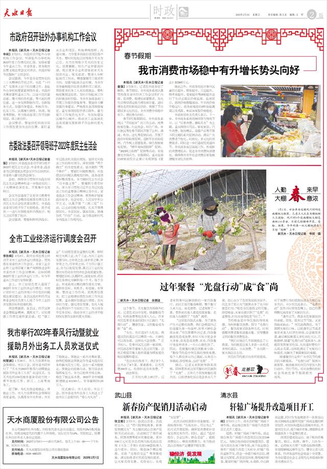 本报讯【新天水·天水日报记者童强】1月31日,记者在市商务局了解到,春节期间,全市商务系统认真贯彻落实省市经济工作会议和扩内需、促消费、稳增长部署要求,加大生活物资调运能力增加库存量,适时增加名优特新商品供给,保障了节日期间多元化供应,全市消费市场稳中有升,增长势头向好。