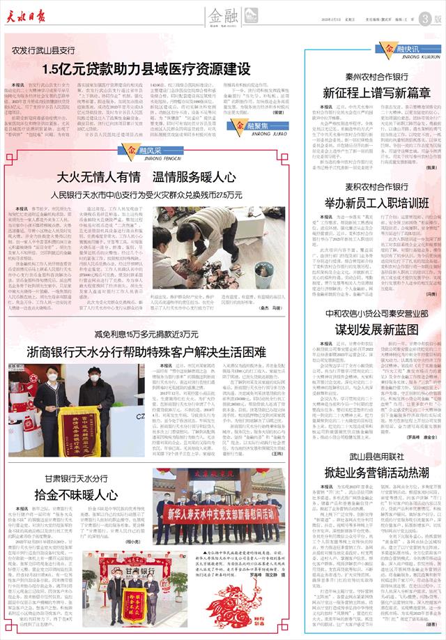浙商银行天水分行始终秉承服务城市、服务民生、服务大局的初心与使命,坚持“金融向善”和“金融为民”理念,以实际行动践行社会责任,为当地经济发展和保障民生贡献着浙行力量。 (王玮)