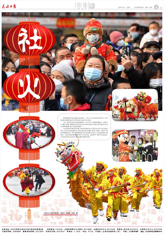 此次社火表演生动展现了天水的本土特色,演出人物类型丰富,有神话传说、古典戏剧、历史典故和反映农村劳动人民生活情景的人物形象,一个个经典的扮相、一次次幽默的互动,为观众带来了无限欢乐。铿锵的鼓声,矫健的舞步,展现着天水人民积极向上的精神风貌,大家用喜庆热闹的表演,祈愿兔年风调雨顺、人民幸福安康。