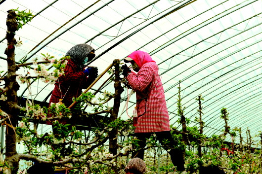 2月9日,裕丰果品种植专业合作社的大棚内,工人们正在给樱桃树人工授粉。