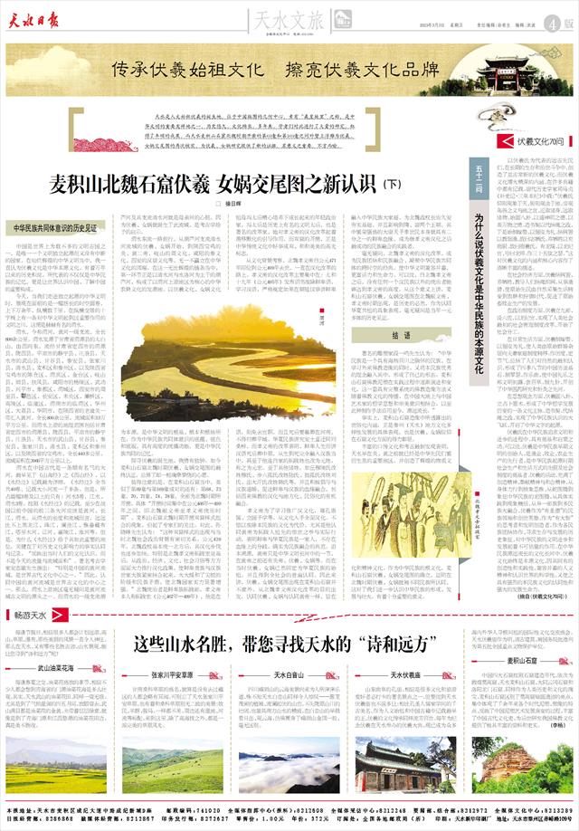 天水是人文始祖伏羲的诞生地,位于中国版图的几何中心,素有“羲皇故里”之称,是中华文明的重要发祥地之一,历史悠久、文化绵长。多年来,学者们对此进行了大量的研究,取得了丰硕的成果。而天水麦积山石窟北魏时期开凿的第69龛和第169龛之间外壁上浮雕为伏羲、女娲交尾图的再次核实,为伏羲、女娲研究提供了新的证据,其意义之重要,不言而喻。
