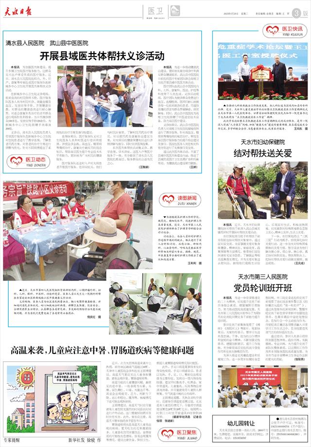 ▲近日,天水市第四人民医院组织肾病神   ▲近日,天水市第四人民医院组织肾病神经内科、心胸肿瘤外科、妇科、儿科、眼科、中医科、功能科党员、医务人员以及兰大一院胸外科帮扶专家赴麦积区桥南铁路小区开展健康义诊活动。