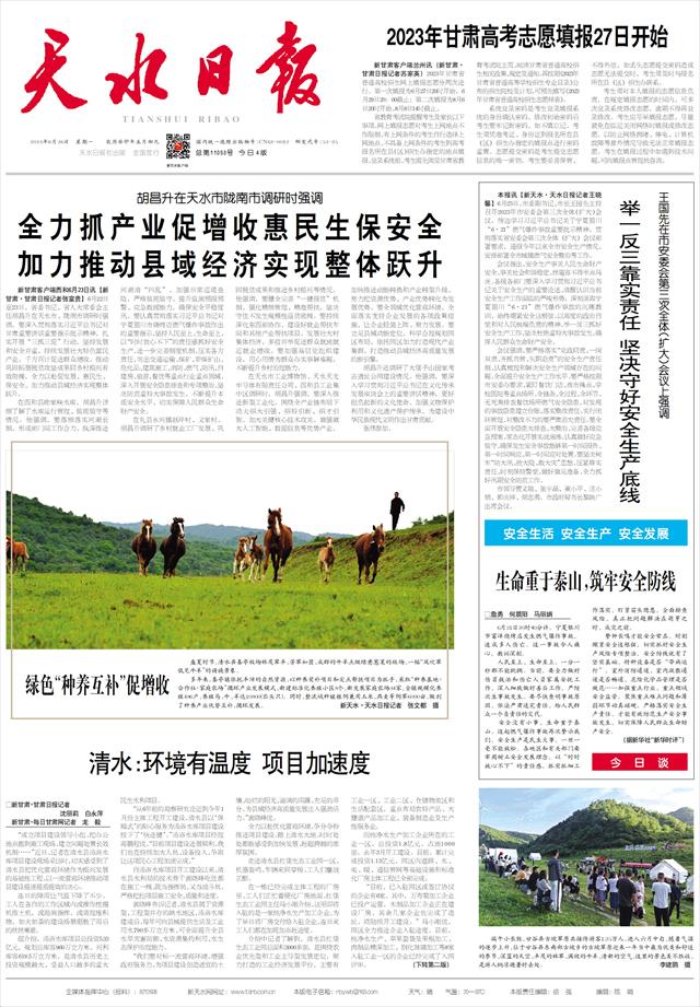 胡昌升在天水市陇南市调研时强调 全力抓产业促增收惠民生保安全加力推动县域经济实现整体跃升   新甘肃客户端西和6月23日讯【新甘肃·甘肃日报记者张富贵】6月22日至23日,省委书记、省人大常委会主任胡昌升在天水市、陇南市调研时强调,要深入贯彻落实习近平总书记对甘肃重要讲话重要指示批示精神,扎实开展“三抓三促”行动,坚持发展和安全并重,持续发展壮大特色富民产业,千方百计促进群众增收,推动巩固拓展脱贫攻坚成果同乡村振兴有效衔接,全力以赴促发展、惠民生、保安全,加力推动县域经济实现整体跃升。