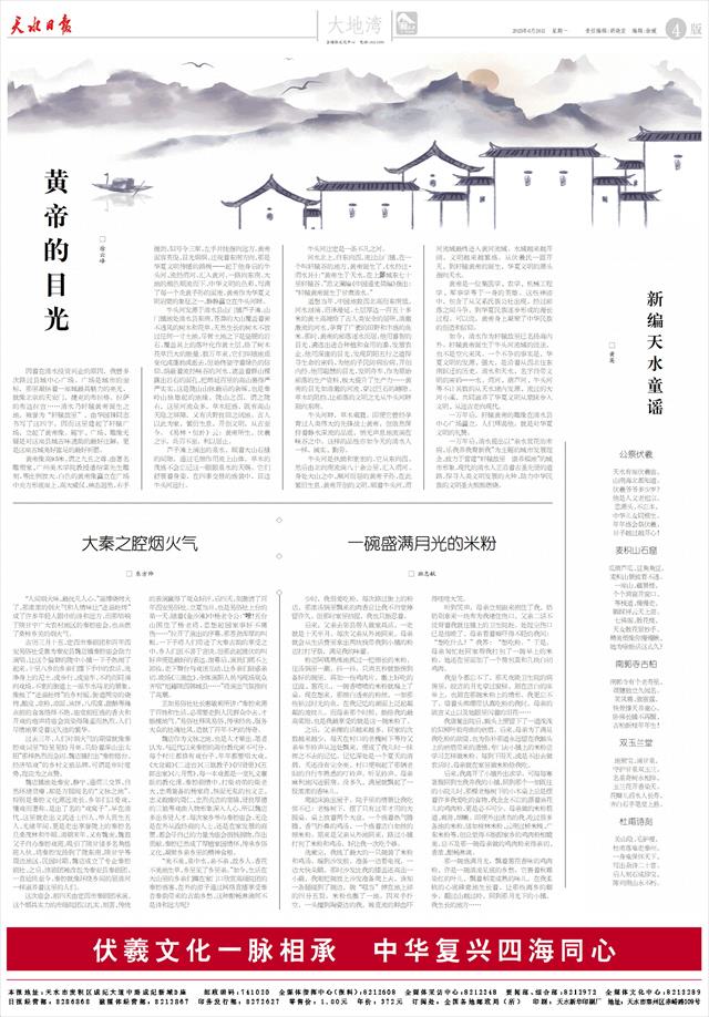 牛头河是执拗和宽宏的。它从东向西,然后由北向南流淌八十余公里,汇入渭河。身处大山之中、濒河而居的黄帝子孙,在此繁衍生息。黄帝开创的文明,顺着牛头河、渭河流域最终进入黄河流域。水域越来越开阔,文明越来越繁盛。从伏羲氏一画开天,到轩辕黄帝的诞生,华夏文明的源头指向天水。