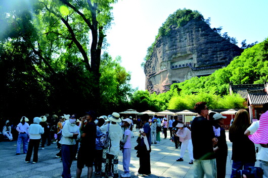 在麦积山石窟检票处,记者看到,在景区工作人员以及暑期志愿者的积极引导下,游客们井然有序进入景区旅游观光、拍照留念。