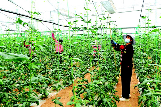 7月25日,秦州区省级现代农业产业园的工人正在为培育的架豆打顶掐头。