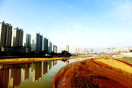 在我很小的时候,这还是一条汹涌澎湃的河流,日夜都能听到它奔流不息的涛声,有时甚至形成水患。每当夏秋之际,暴雨过后,圉河水猛涨,上游常常会漂来椽棒檩子、猪鸡牛羊,胆大会洑的人,便跳入水中,捞一把浮财,岸上看河的人,常常一脸羡慕之色。然而,这种盛况渐行渐远、愈行愈远,直至成为儿时记忆。特别是20世纪90年代以来,甘谷十年大旱,曾经奔腾澎湃的圉河,只是溪流潺湲,像一位弱不禁风的女子,红消翠减、气血不足,河道内便有人开荒种菜。加之人们爱河意识淡薄、行为不拘,往河流里任意排污、倾倒垃圾,在河床里采砂,满目疮痍的圉河常常是“水落而石出”,几度断流,而或浊流滚滚、污流不断……