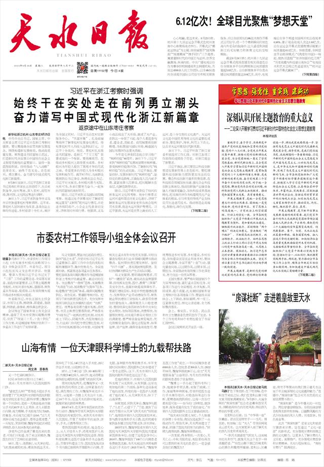 核心凝聚力量,旗帜指引方向。全市各级党组织和广大党员干部一定要以这次主题教育为契机,全面、系统、深入学习习近平新时代中国特色社会主义思想,以饱满的政治热情、扎实的工作作风、严明的工作纪律,高标准高质量开展好主题教育,奋力谱写中国式现代化天水实践新篇章。
