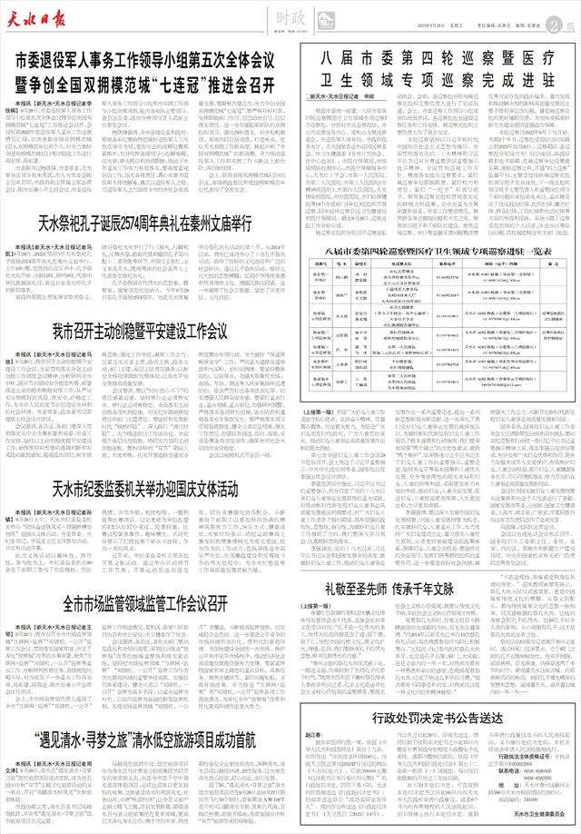 根据市委统一部署,八届市委第四轮巡察暨医疗卫生领域专项巡察7个巡察组,分别对市应急管理局、市公共资源交易中心、麦积山大景区管委会、市退役军人事务局、市政府政务大厅、天水国家农业科技园区管委会、市卫生健康委(含市计生协会、市中心血站)、市医疗保障局、市疾病预防控制中心、市医疗保障服务中心、天水红十字会、市第一人民医院、市第二人民医院、市第三人民医院(市精神病医院)、市第四人民医院、天水传染病医院、市中医医院、市妇幼保健院等18个市直部门(单位)党组织开展巡察,同步延伸巡察县区卫生健康局和医疗保障局。截至9月28日,巡察进驻工作全部完成。