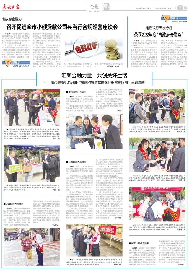 ▲9月26日是全国金融消费者权益保护集中教育宣传日,国家金融监督管理总局天水监管分局、市银行业协会、市保险行业协会组织全市银行、保险、证券等机构开展了以“汇聚金融力量 共创美好生活”为主题的进社区、进农村、进企业、进商圈、进校园集中宣传活动,向公众宣传普及维护金融消费者合法权益知识,提升公众金融素养。 陈飞 摄