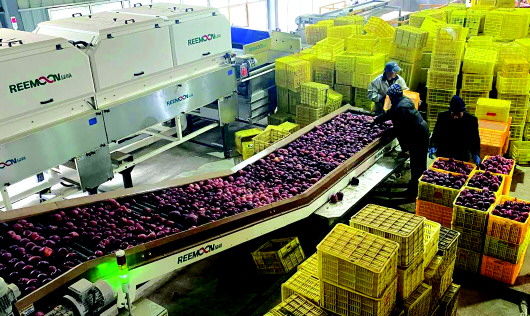 连日来,在甘谷县安远镇店子村的佳农果蔬种植农民专业合作社里,工作人员正在分选线上筛选苹果。