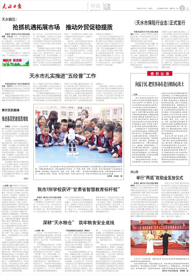 仓廪实,天下安。粮食安全是“国之大者”,是实现经济发展、社会稳定和国家安全的重要基础。党的十八大以来,习近平总书记就国家粮食安全发表一系列重要论述,强调“要始终把保障国家粮食安全摆在首位,加快实现农业农村现代化”。天水市各级各部门深入学习领会、认真贯彻落实,扛稳粮食安全重任,为保障区域经济社会发展提供了坚实支撑。