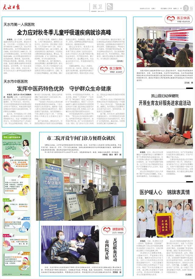 天水市中医医院 发挥中医药特色优势 守护群众生命健康   本报讯【新天水·天水日报鞠玮莉 范少杰】近期,儿童呼吸道疾病感染高发,医院门诊急诊就诊患儿数量增多。为了科学应对、早防早治,天水市中医医院根据本次疫情发病特点和时令气候特点,积极发挥中医药在预防治疗疫病方面的独特优势,守护群众生命健康。