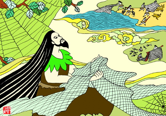 自从那天以后,伏羲是饭吃不香觉睡不好,整天琢磨着捕鱼这件事。几天过去了,也没有想出个好办法来。这天,伏羲看到房屋一角有一只蜘蛛正在织网,于是精神一振仔细观察,只见蜘蛛横一道竖一道不停地织,一会儿网便织好了。网上粘了很多小飞虫,蜘蛛不费力气就吃饱了。伏羲想,人为什么不能织一个网去捕鱼呢?他把这个想法跟女娲一说,女娲也觉得是个好办法。织网得用绳,于是他们就找来兽筋、皮条、软草开始织网,经过反复实践网终于织成了。