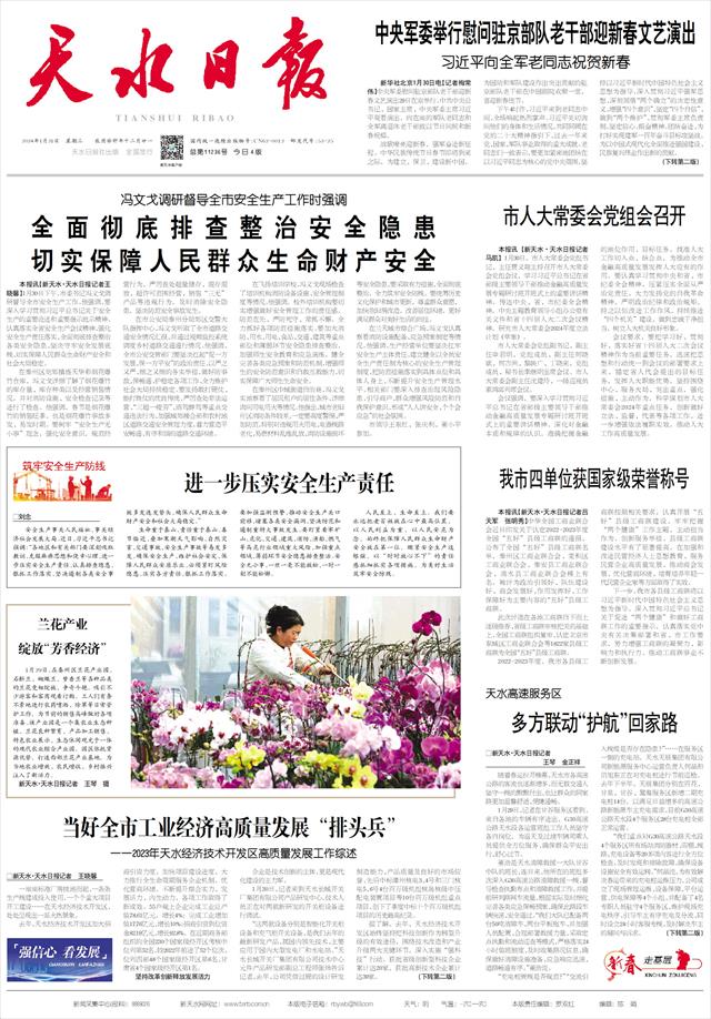 冯文戈调研督导全市安全生产工作时强调 全面彻底排查整治安全隐患切实保障人民群众生命财产安全   本报讯【新天水·天水日报记者王晓馨】1月30日下午,市委书记冯文戈调研督导全市安全生产工作。他强调,要深入学习贯彻习近平总书记关于安全生产的重要论述和重要指示批示精神,认真落实全省安全生产会议精神,强化安全生产责任落实,全面彻底排查整治各类安全隐患,坚决守牢安全发展底线,切实保障人民群众生命财产安全和社会大局稳定。