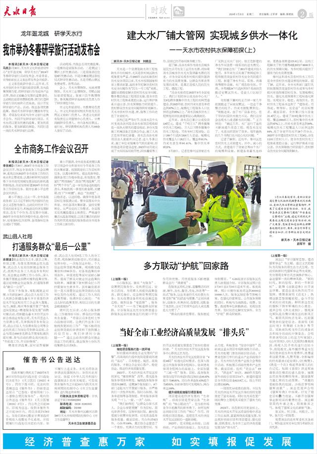 天水是一个资源型缺水和工程性缺水并存的城市,尤其是农村地区缺水现象更为严重,自2005年启动实施农村饮水安全项目以来,天水市按照国家和省上要求部署,连续多年把解决农村饮水安全问题作为“民生一号工程”来抓,着眼长期稳定解决农村饮水安全问题,整乡整县推进工程项目实施,使全市农村供水工程体系更趋完备,运行管护体系日益完善,供水保障能力明显提升,农村群众饮水安全问题得到有效解决,天水市农村供水建、管、服等工作均走在了全省前列。