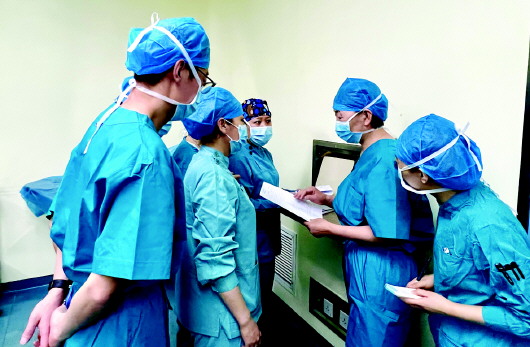 ▲兰大一院麻醉手术科刘亚涛主任、陶贵彦护士长对市四院手术麻醉科各项工作提出指导意见。