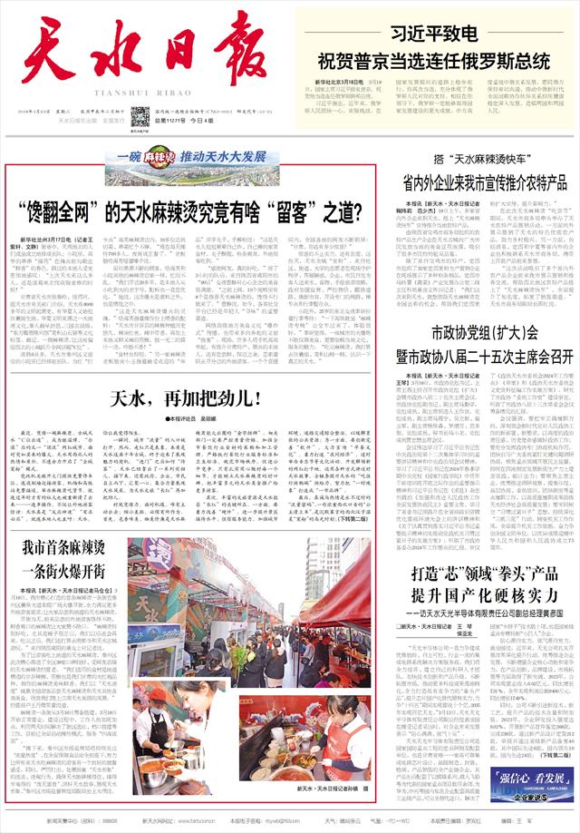 天水麻辣烫的故事,让“千山万水、就爱天水”开了一个好头。相信千年古城的开放包容,厚道“甘味”的满满诚意,社会各方的拾柴添薪,定会让“天水麻辣烫”这把火越烧越旺。从这个春天出发,让我们以真心换“流量”,用行动换“长红”,举一城之力迎八方来客,上下齐心让古城焕发出新的光彩与活力。