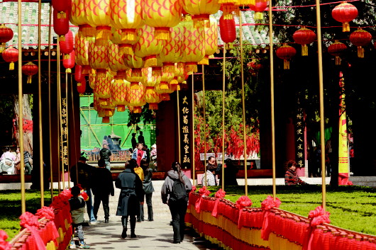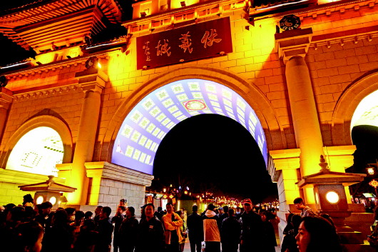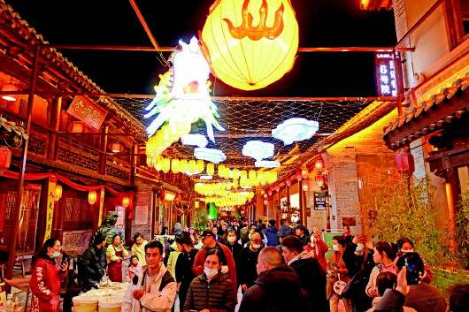 白天,徜徉于西关古城和伏羲城,脚踩石板路、抬头望古树,仿佛回到了古秦州城。夜晚,西关古城高悬的灯笼被点亮,伏羲城东牌坊拱门内的太极图彩灯熠熠生辉,整个西关里笼罩在一片流光溢彩之中。 新天水·天水日报记者孙镇 摄