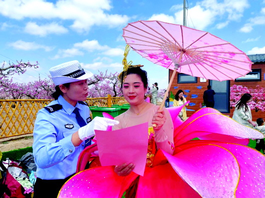 4月12日,秦安县公安局交警大队宣传民辅警深入刘坪镇秦洼村桃花堡,以花为媒,巧借“桃花会”开园仪式,创新宣传形式,组织宣传民辅警开展交通安全宣传活动,成为桃花会主会场一道亮丽的风景线。 康瑞萍 摄