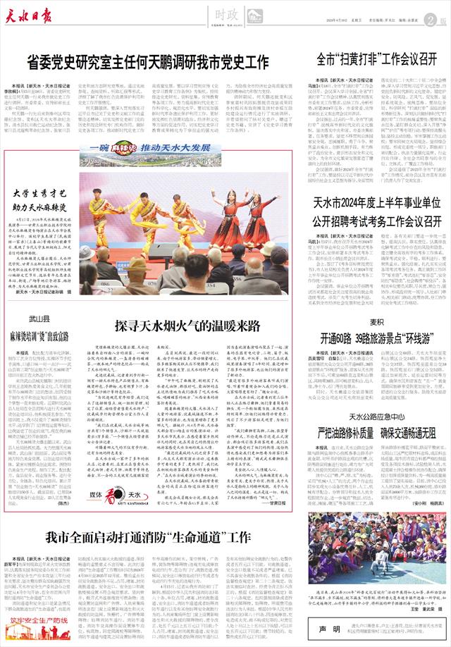 本报讯【新天水·天水日报记者李欣桐】4月15日至18日,省委党史研究室主任何天鹏一行来我市就党史工作进行调研。市委常委、宣传部部长王文东一同调研。