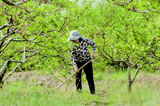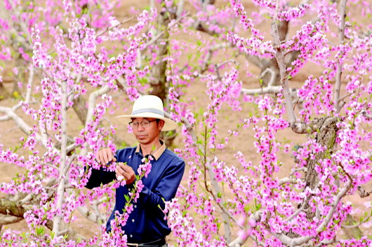 ◤秦安县刘坪镇秦洼村的果农为桃树疏花。