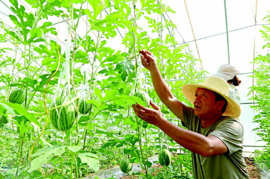 ▲麦积区渭南镇杨赵村设施蔬菜种植基地,产业工人为西瓜套袋。