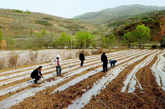 ◤武山县龙台镇阳屲村马铃薯种植基地,群众忙着平整土地、施肥培土、铺整地膜。