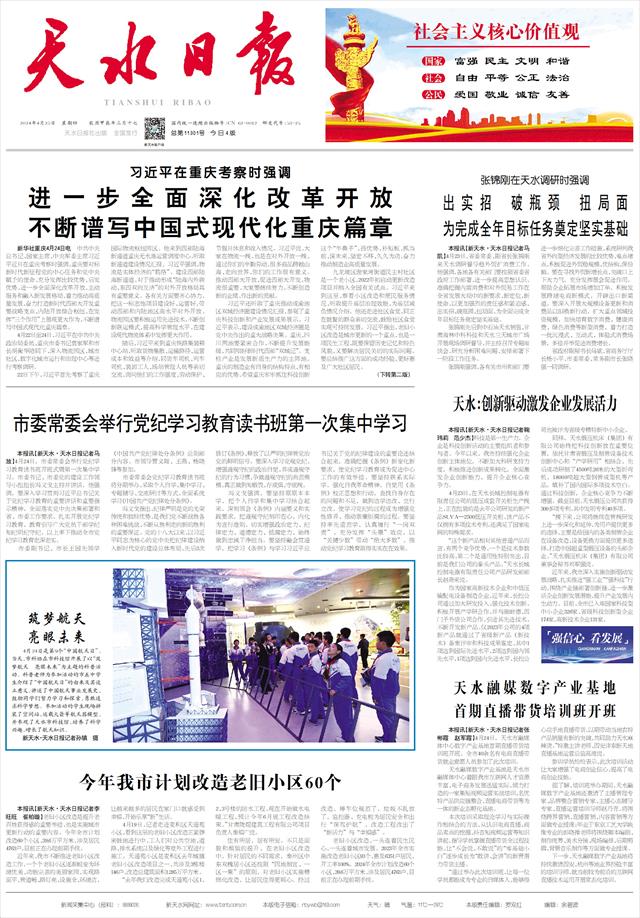 市委常委会举行党纪学习教育读书班第一次集中学习   本报讯【新天水·天水日报记者马放】4月24日,市委常委会举行党纪学习教育读书班开班式暨第一次集中学习。市委书记、市委党的建设工作领导小组组长冯文戈主持并讲话,他强调,要深入学习贯彻习近平总书记关于党纪学习教育的重要讲话和重要指示精神,全面落实党中央决策部署和省、市委工作要求,扎实开展党纪学习教育,教育引导广大党员干部学纪知纪明纪守纪,以上率下推动全市党纪学习教育走深走实。