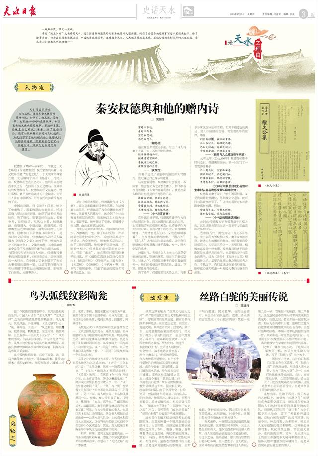 丝路白驼的美丽传说 □ 王建兴   丝绸之路被喻为“世界文化的大运河”和“推动古代世界历史车轮转动的主轴”。穿越甘肃的丝路古道,曾有多条线路和多种走法。其北道出长安、向西北,直通武威;其南道沿渭河、过宝鸡、溯千水,至陇县翻陇山复沿渭河西行,经天水、陇西、临洮折而向北,至兰州渡黄河、再北行,越乌鞘岭至武威,入河西走廊抵达敦煌。两相比较,南道虽多出约4天行程,但沿途人烟较密,安全性好。清水地处陕甘交界、扼守甘肃东门、锁钥陇坂咽喉,自古为丝路南道要冲。东出长安行至陇县的丝路商队过固关越陇坂,或沿今张家川县马鹿镇、恭门镇到清水县城,经今清水县草川铺镇、麦积区社棠镇抵达天水;或沿今张家川县龙山镇,经今清水县白驼镇、秦安县陇城镇及秦安县城抵达天水。据资料记载,汉唐鼎盛时期,由于交通安全、补给充足,丝路南道车轮滚滚,商旅队队,驼铃声声,丝绸西去,珠宝东来,贸易往来繁荣,沿途重镇兴起。尤其是唐代天水,“繁富大出于陇右”,即使在“安史之乱”不久,仍可看到“城上胡笳奏”“胡舞白斜题”的偏安升平城市景象。
