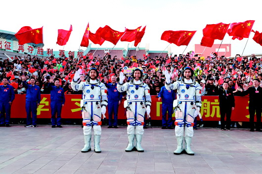 4月25日,航天员叶光富(右)、李聪(中)、李广苏在出征仪式上。 新华社记者 李刚 摄