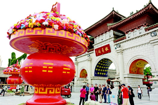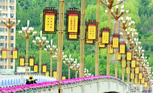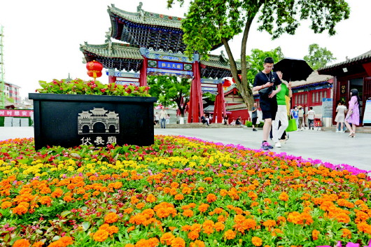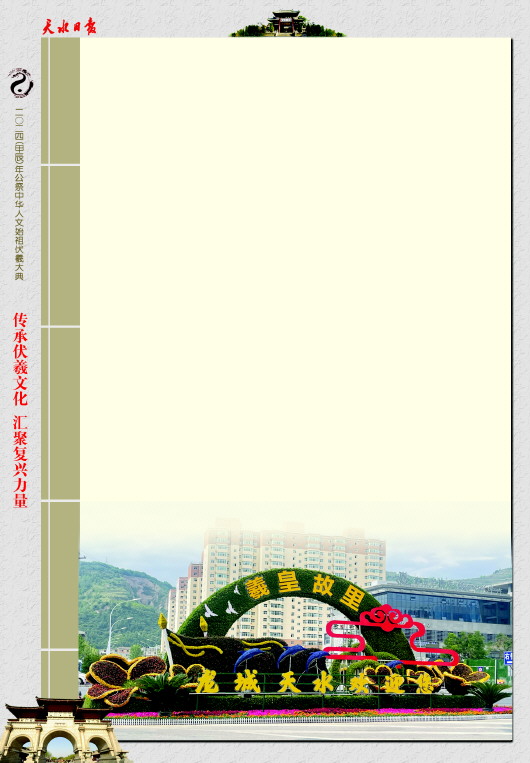 2024(甲辰)年公祭中华人文始祖伏羲大典即将于6月21日在我市举行。大典前夕的龙城天水花团锦簇、张灯结彩。秦州城区各街道、广场上由各色鲜花组成的花柱、花钵、花箱、花坛和立体景观绚丽多彩,宣传伏羲文化的灯杆标示牌庄重典雅。工作人员忙着浇花、悬挂红灯笼、清洁卫生,将城区装扮一新,迎接全球华人来这里寻根祭祖。