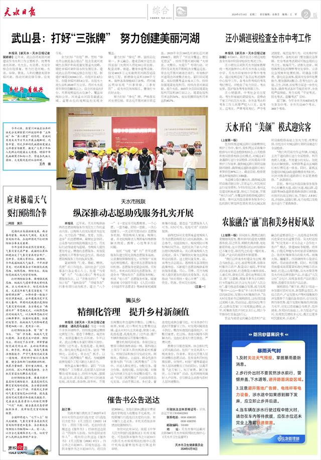本报讯【新天水·天水日报记者裴婷婷】近年来,武山县将美丽河湖建设作为水利工作主要抓手,统筹考虑水环境、水生态、水资源、水安全综合治理修复,努力打造河畅、水清、岸绿、景美、人和的健康美丽幸福河湖,推动河湖应绿尽绿、应美尽美。