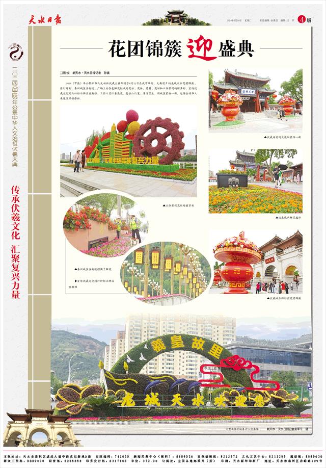 2024(甲辰)年公祭中华人文始祖伏羲大典即将于6月21日在我市举行。大典前夕的龙城天水花团锦簇、张灯结彩。秦州城区各街道、广场上由各色鲜花组成的花柱、花钵、花箱、花坛和立体景观绚丽多彩,宣传伏羲文化的灯杆标示牌庄重典雅。工作人员忙着浇花、悬挂红灯笼、清洁卫生,将城区装扮一新,迎接全球华人来这里寻根祭祖。