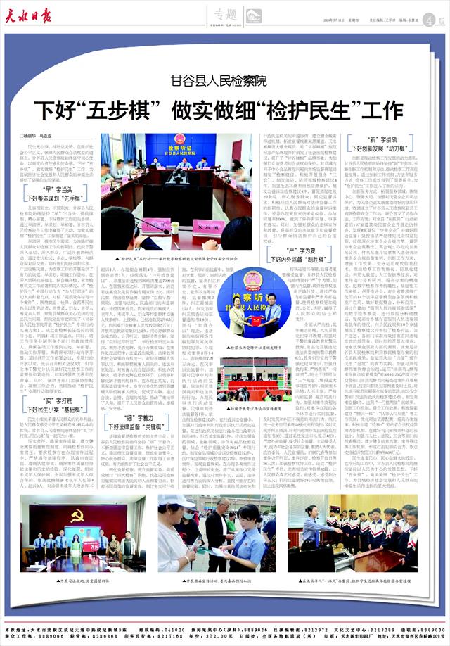 民生无小事,枝叶总关情。在维护社会公平正义、保障人民群众合法权益的道路上,甘谷县人民检察院始终坚守初心使命,以高度的责任感和使命感,下好“五步棋”,做实做细“检护民生”工作,为县域经济社会发展和人民群众的幸福生活提供了坚强的法治保障。