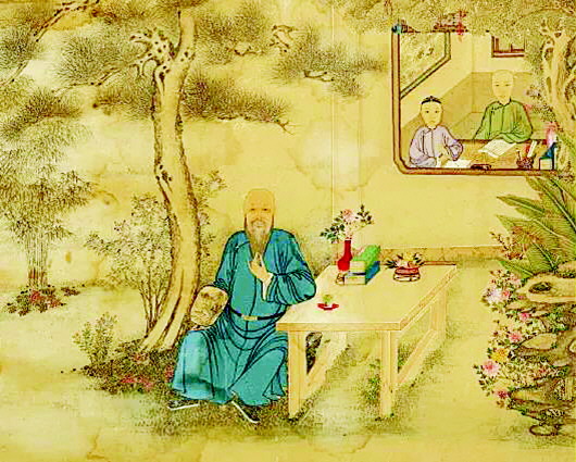 我们观赏这幅画,能够体察出比画主人本身更多的人生况味来。中年人坐在庭院中,既不打扰屋内的子弟学习,也会监督、指导他们读书,既是一种天伦之乐,也能将诗书的精义告知后代,使得家学得以继承和流传下去。一位读书人一生的读书可分为前后两个阶段:第一个阶段是为了获得官职,无论是汉代的学习五经,还是隋唐以后的科举制,都是将读书作为敲门砖,这是被动学习,带有功利色彩,但也会打下良好的基础,中国人用“十年寒窗”“寒窗苦读”来概括这一阶段。两位少年子弟,就处在第一阶段。第二个阶段则是步入仕途以后,是一种自觉的学习,有思想、有文采的人还会著书立说。一般的士大夫自己衣食无忧、功成名就,此时最重要的是对子弟儿孙的教育,督促他们学习,好让子孙有所成就。窗里窗外,一在青春时,一在中年时,虽是两种境遇,却都是人生路上的一个环节。清代嘉庆年间,礼部尚书姚文田自题书房的对联: