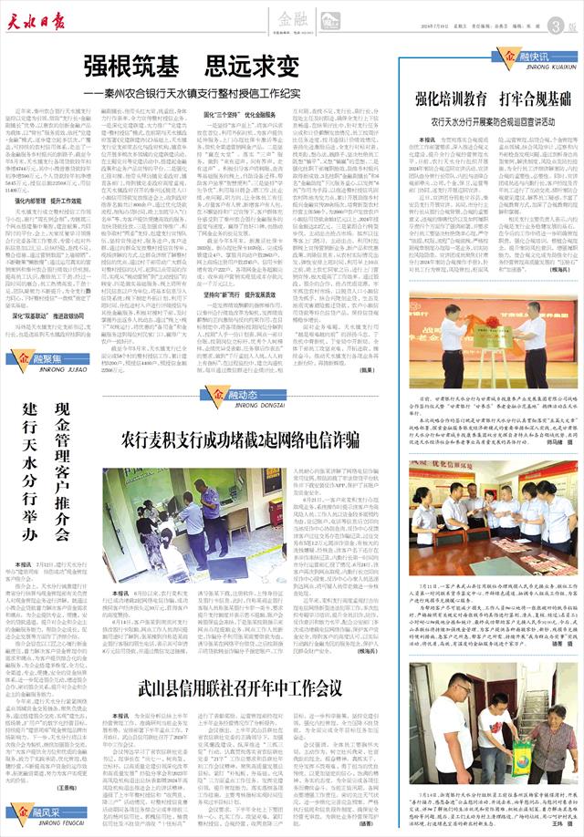 强化培训教育 打牢合规基础 农行天水分行开展案防合规巡回宣讲活动   本报讯 为贯彻落实合规提质创优工作部署要求,深入推进合规文化建设,提升全行合规经营管理水平,日前,农行天水分行组织开展2024年案防合规巡回宣讲活动,宣讲团队由分管行长带队,内控与法律合规部牵头,公司、个金、保卫、运营等部门协同,逐支行开展巡回宣讲。