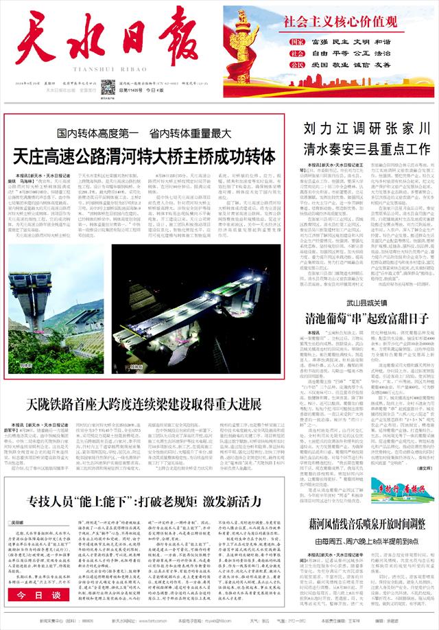 国内转体高度第一 省内转体重量最大 天庄高速公路渭河特大桥主桥成功转体   本报讯【新天水·天水日报记者柴琪 马海林】“我宣布,天庄高速公路渭河特大桥主桥转体圆满成功!”8月29日00时05分,伴随着工程总指挥充满激情的声音落下,由中铁七局集团承建的国内转体高度最高、省内转体重量最大的天庄高速公路渭河特大桥主桥完成转体。该项目作为天庄高速控制性工程,它的成功转体,为天庄高速公路年底全线通车运营奠定了坚实基础。